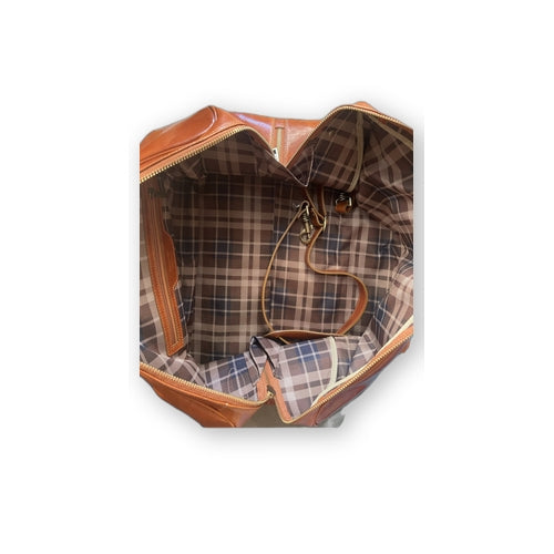 Realizzato a mano in vera pelle italiana di alta qualità, il Borsone in pelle bicolore in tinta cuoio naturale combina eleganza e funzionalità in un design senza tempo.