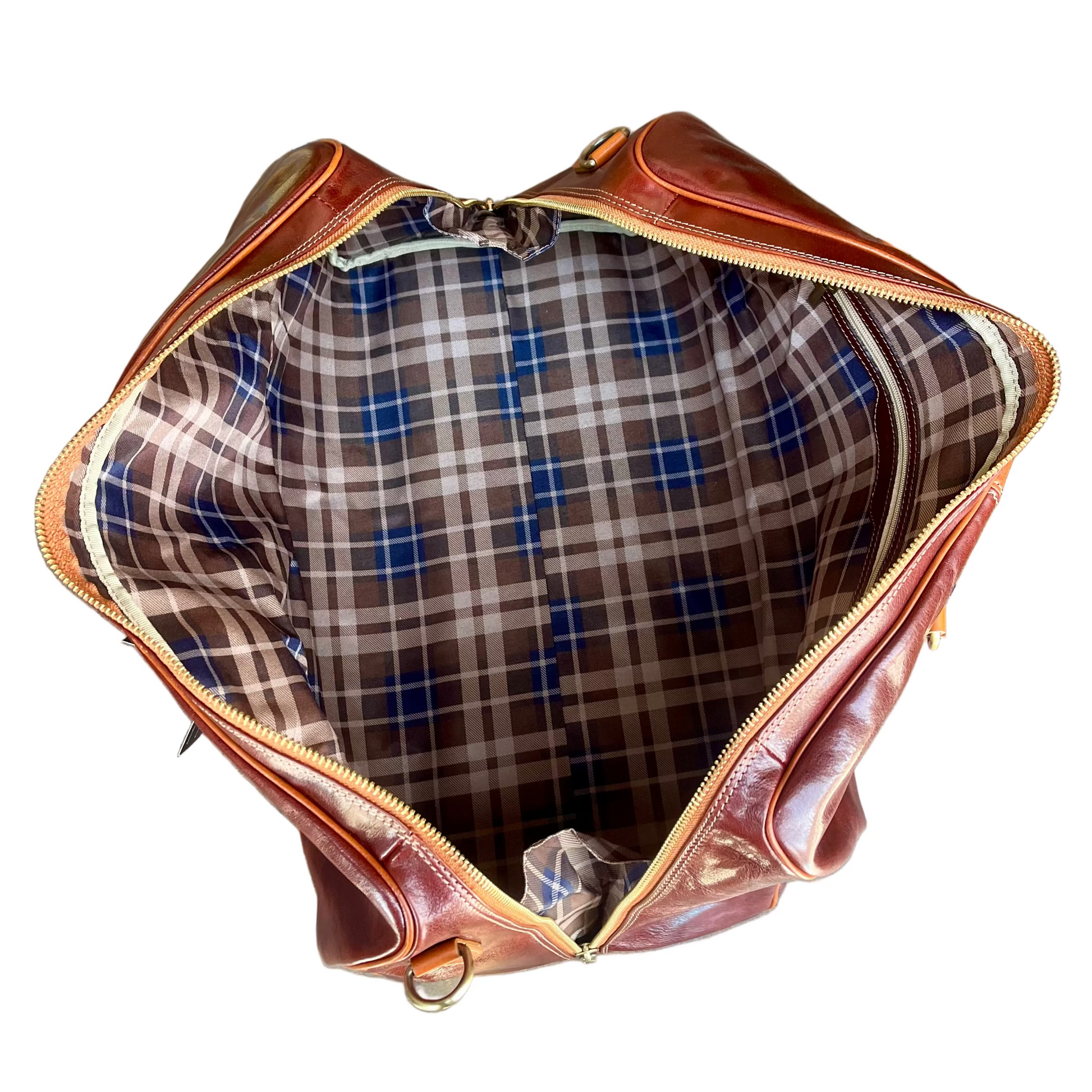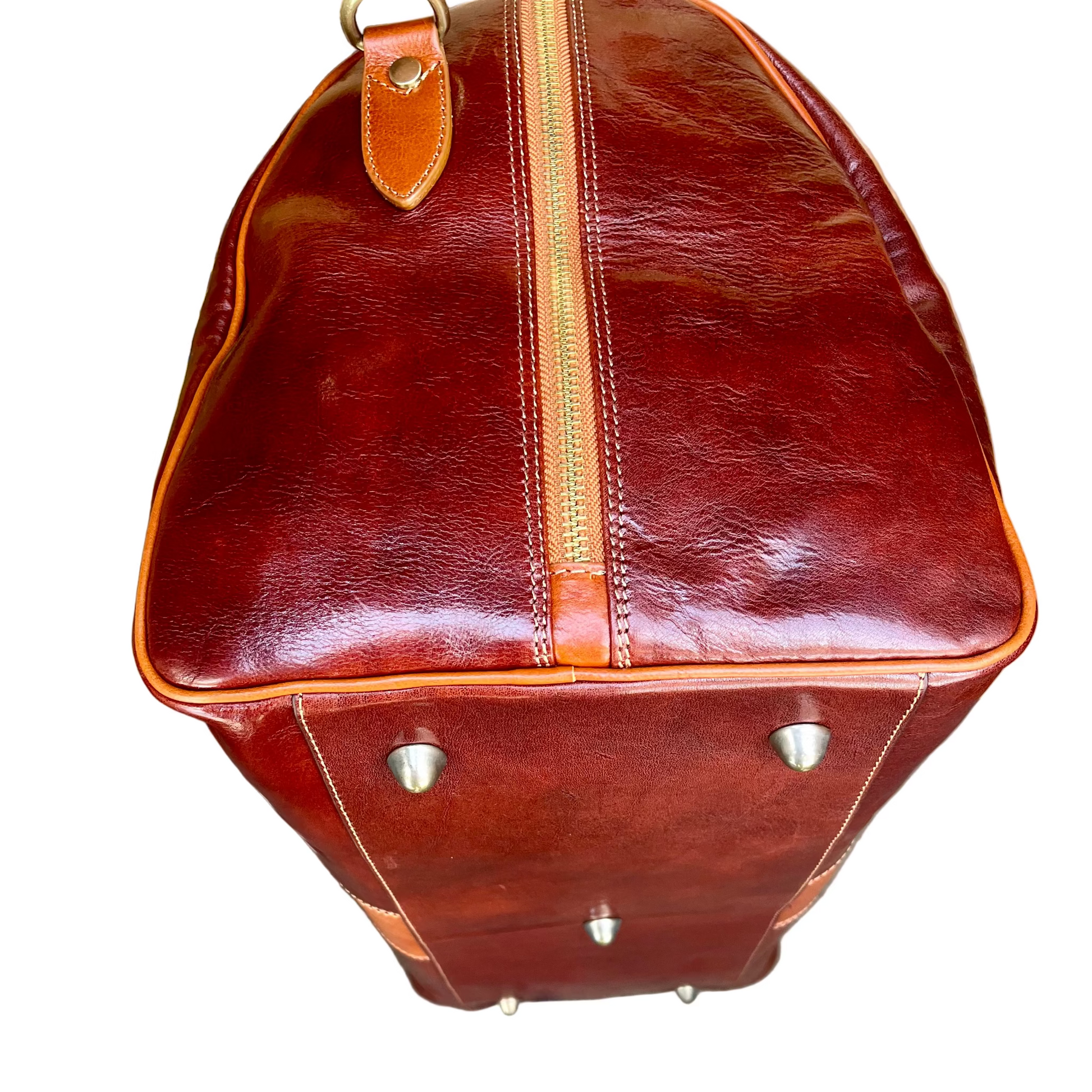 Realizzato a mano in vera pelle italiana di alta qualità, il Borsone in pelle bicolore in tinta cuoio naturale combina eleganza e funzionalità in un design senza tempo.