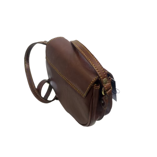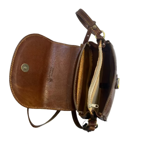 La patta frontale e la tracolla regolabile in pelle assicurano praticità e comfort, mentre l’interno foderato offre spazio sufficiente per custodire gli oggetti essenziali.